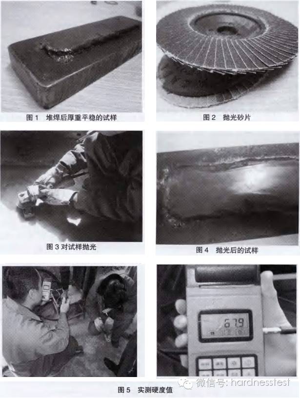 对堆焊层先用砂轮片打磨除锈,再用800-100目的抛光砂片对堆焊层进行抛光处理,见图3、4.便携式硬度计的工作温度在-20-60℃ ,因此,一定要等工件冷却后测试硬度。